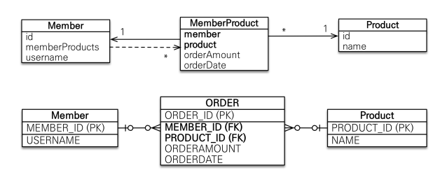 다대다 관계를 일대다 다대일 관계로 풀어서 매핑한 다이어그램과 코드는 다음과 같다.