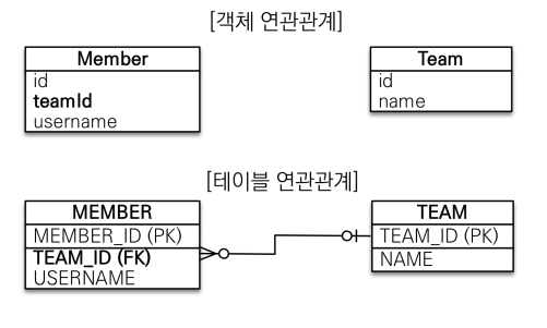 위 그림처럼 테이블 연관관계에서는 MEMBER테이블에 TEAM_ID라는 외래키가 있고,